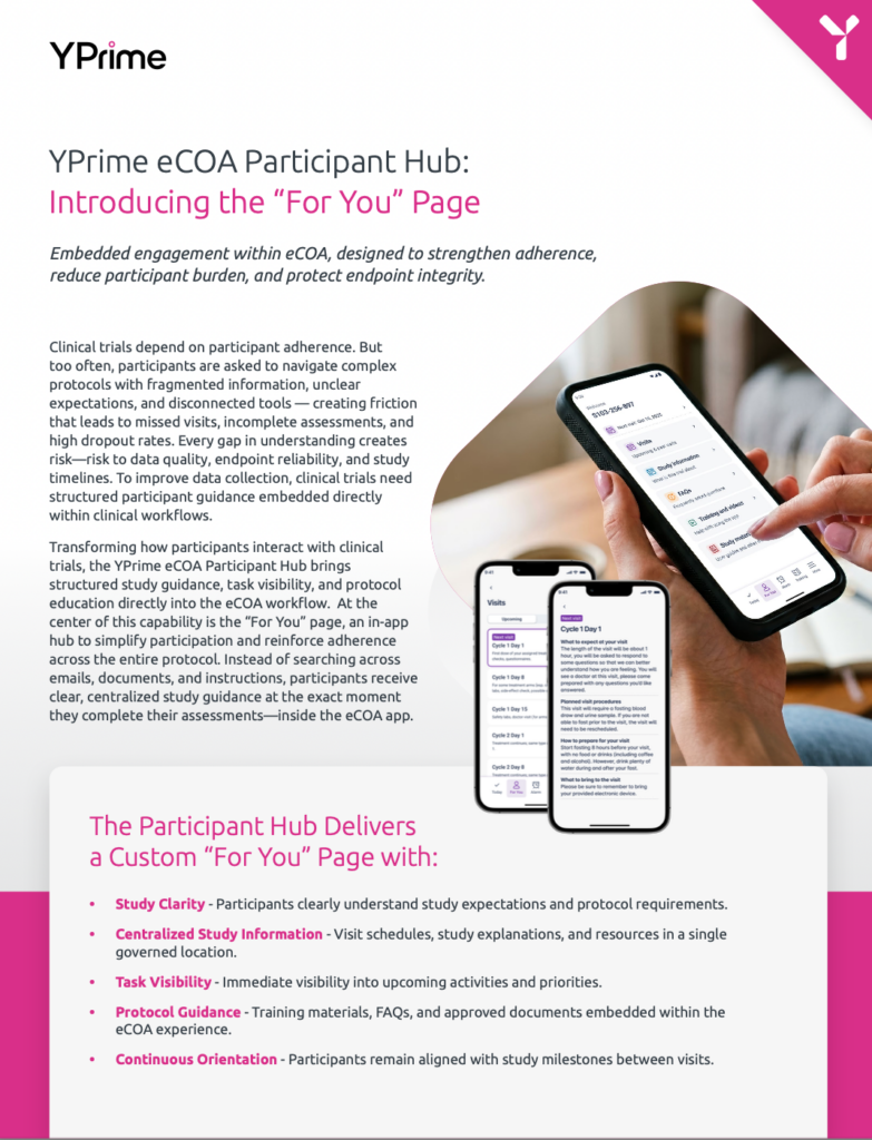 The YPrime eCOA Participant Hub helps sponsors deliver clearer study experiences while strengthening adherence and protecting endpoint integrity. Fill out the form to access the fact sheet, or book a personalized demo to see the platform in action.